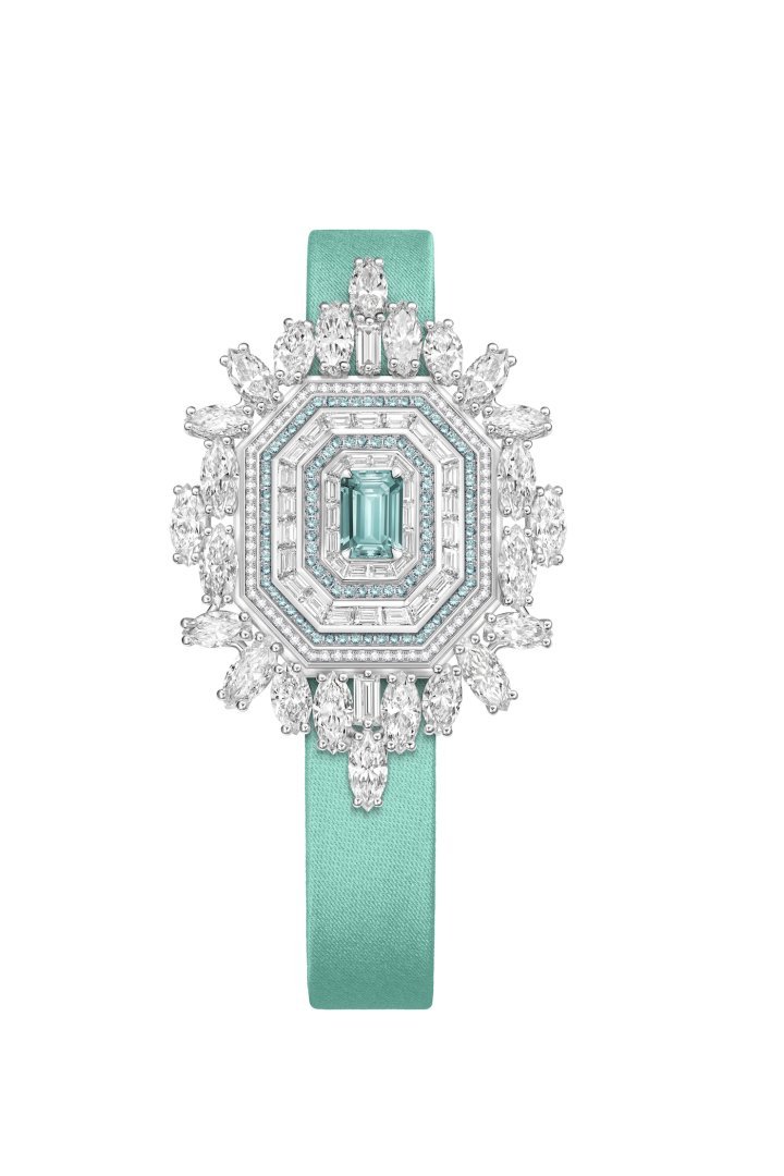 Emulating the stepped facets of an emerald-cut gemstone, the octagonal 18-karat white gold case is constructed like a pyramid. The different tiers are set with brilliant- cut or baguette-cut gemstones of increasing dimensions and crowned at the summit with a fabulous 1-carat emerald-cut gemstone.