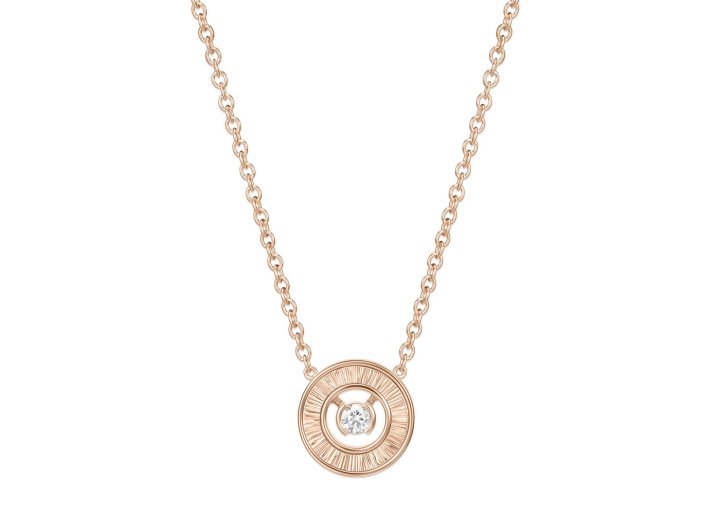 Two smaller, more refined pendants showcase the signature Decor Palace engraving in rose or white gold, each set with a brilliant-cut diamond cradled between sculptural brackets and paired with matching bracelets. Medium pendants feature playful contrasts, mirror-polished or diamond-set gold paired with Decor Palace textures, brought to life by a diamond-set jump ring. A larger pendant, adorned with further diamonds and a palm-mesh chain, amplifies the sophistication. Completing the collection, rose gold earrings enriched with diamonds and Decor Palace detailing bring Piaget’s soothing, sensual touch across the body.