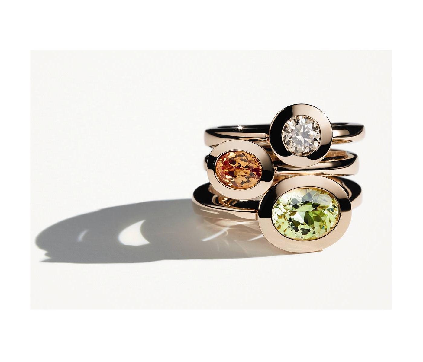 Rings in 18K rose gold set with a diamond, garnet and chrysoberyl by