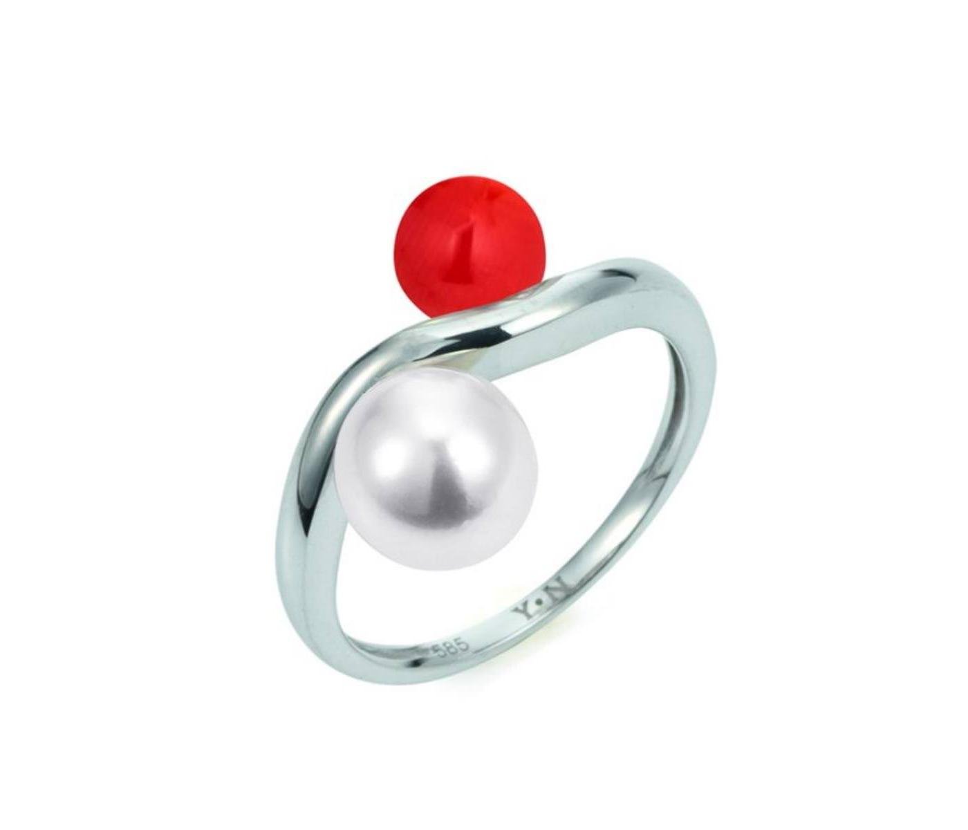 Akoya Cultured Pearl Ring AP52, white gold with coral by